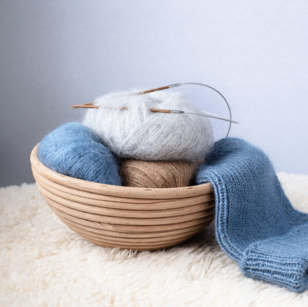 A fine and luxurious blend of silk, wool, and mohair. This high-quality yarn doesn’t pill or shed – unlike some of the more affordable mohair alternatives.